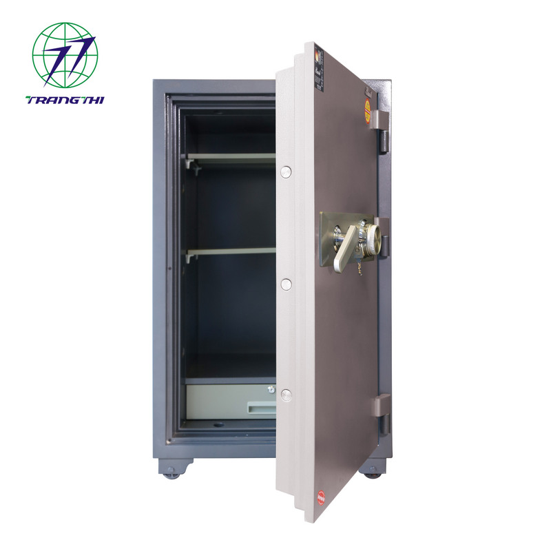 - Chi tiết bên trong lòng két sắt chống cháy Hàn Quốc Booil BS-C1200, phần cánh két có 6 chốt chìm đảm bảo cho tính an toàn cao của két. Trong lòng két có 1 đợt di động và 1 ngăn kéo mở bằng khóa chìa.
